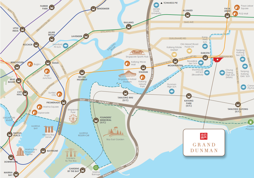 In just one stop, you're at Paya Lebar MRT; two stops will take you to Stadium MRT; four stops bring you to the CBD, and five stops lead you to Marina Bay Sands and Bugis.
